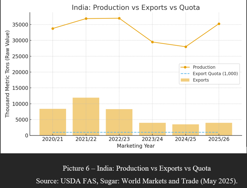Despite maintaining high cane yields, India limits sugar exports to 1 million tons through a quota system to safeguard domestic supply.