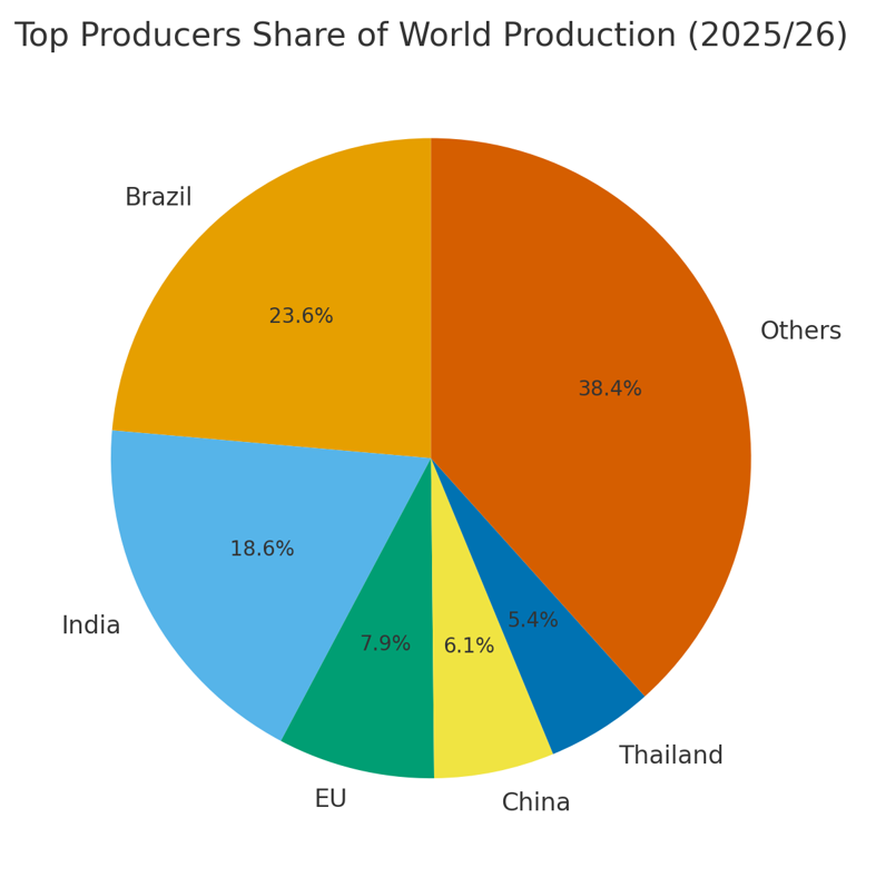 Brazil maintains its dominance in global exports, benefiting from good weather in São Paulo and Paraná, which allows for flexible allocation of sugarcane between sugar and ethanol production.
